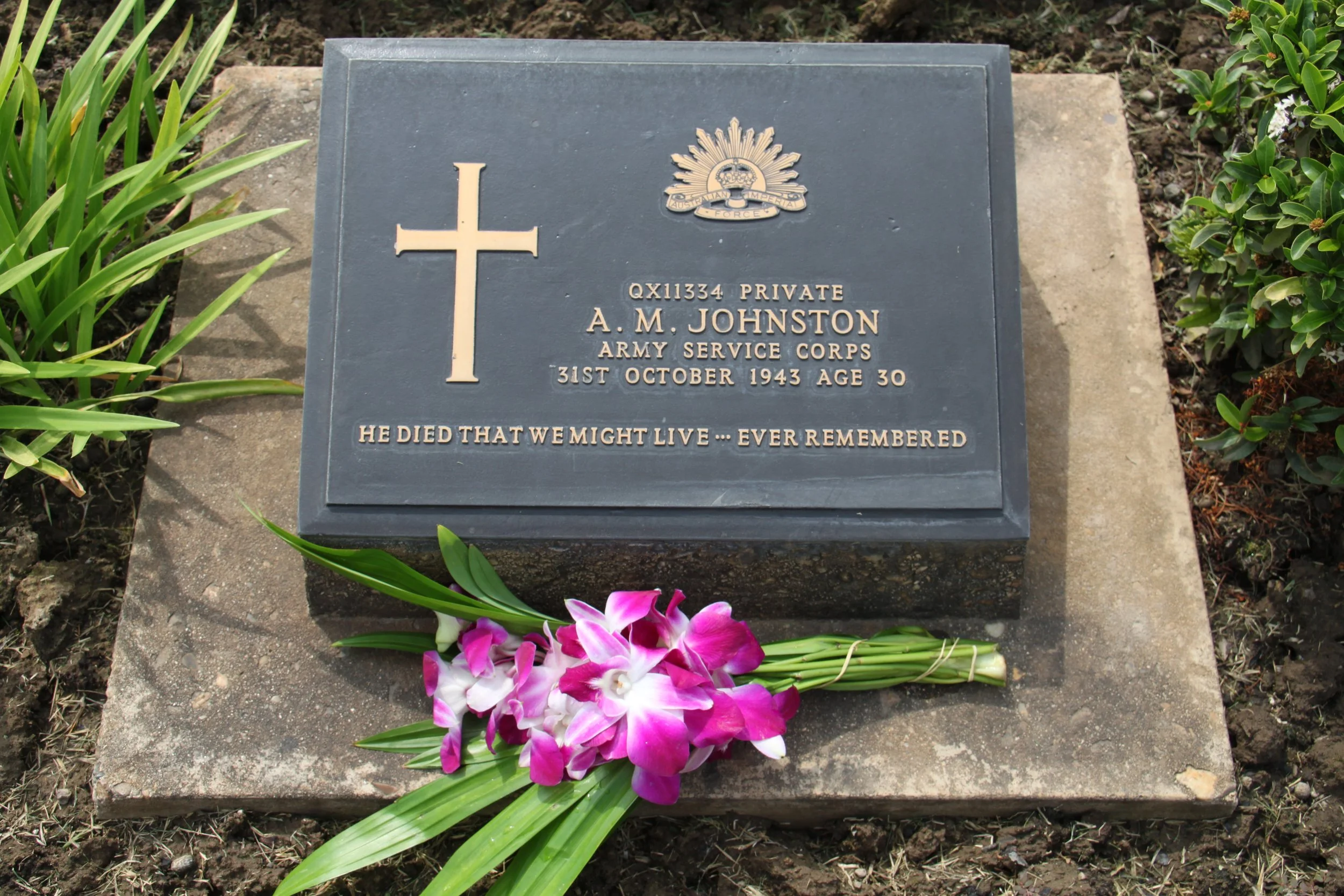 Mick Johnstonās grave at Kanchanaburi War Cemetery