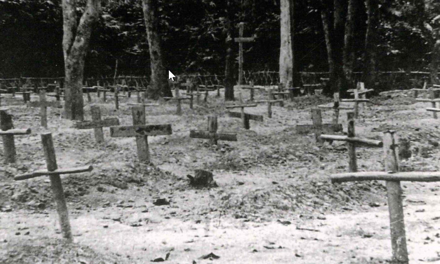 In the case of Mick Johnston and Edward Parker, there were also four Dutch POWs expected to pass at the same time. A grave, large enough to hold six persons, was dug. On the 22nd and 23rd October 1943, the four Dutchman died and were placed in the grave awaiting Mick and Edward. Edward died on the 24th October and was laid with the Dutch POWs. However, Mick continued to defy predictions, but his situation was hopeless. The grave holding the five POWs was partly filled waiting for Mick. Something that would prove invaluable to Mickās family decades later. On the 31st October 1943, a week later, Mick finally succumbed. He was buried on top of the dirt which covered the other five POWs and the grave was closed.